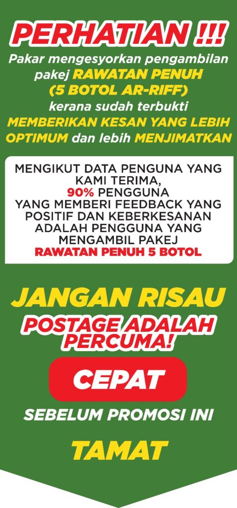 *PENAFIAN: Keberkesanan produk ini bergantung kepada kesesuaian individu. Setiap hasil dari penggunaan adalah berbeza bagi setiap individu. Produk ini akan memberi kesan terbaik sekiranya pengguna mengamalkan dengan cara betul berdasarkan banyak testimoni yang diperolehi. Pengguna dinasihatkan menggunakan produk ini seperti arahan pada produk. Namun kami tidak bertanggungjawab jika sebarang masalah/komplikasi berlaku kepada pengguna di atas penggunaan produk ini.